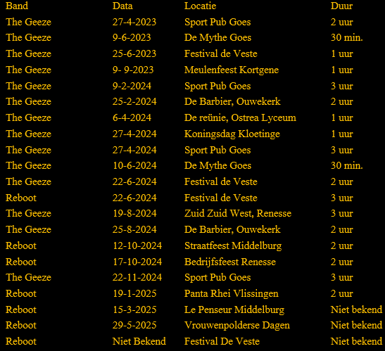 In het overzicht hiernaast kunt u mijn (grotere) optredens terug vinden. Mijn eerste 'echte' optreden was op 27-4-2023, bij de Sport pub in Goes. Sinds dien zijn de optredens stukje bij beetje groter geworden.